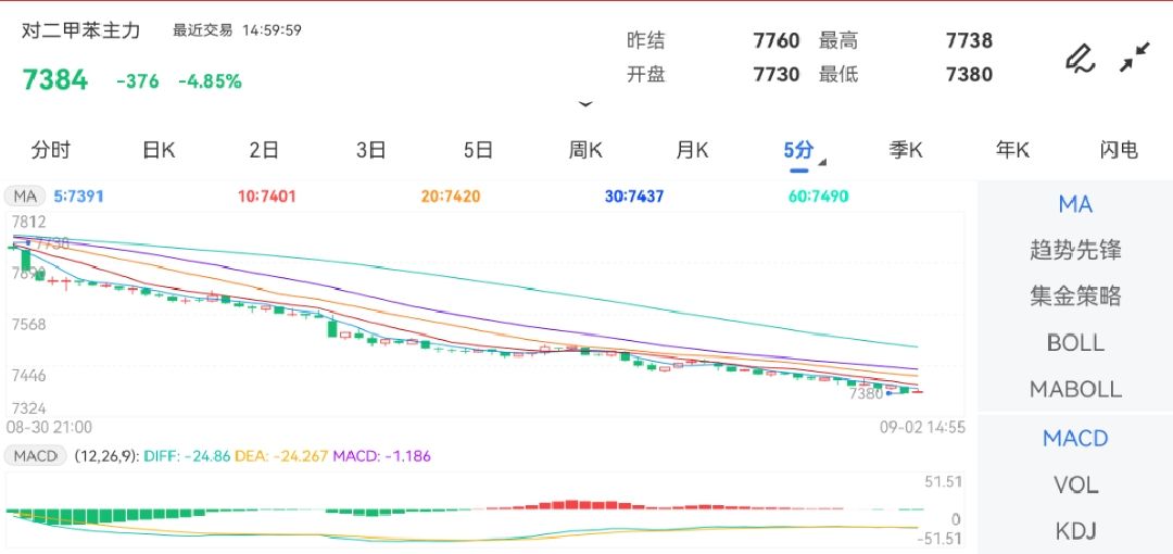 9月2日,邦内期市化工板块全线飘绿。个中,对二甲苯期货主力合约开盘报7730.0元/吨,今日盘中低位颤动运转;截至午间收盘,对二甲苯主力最高触及7738.0元,下方探低7430.0元,跌幅达3.97%。