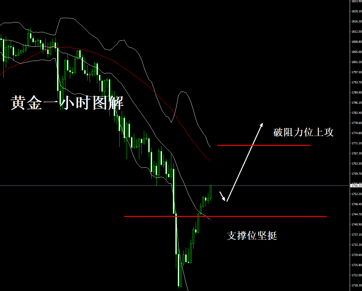 黄金一小时k线从布林带下轨发力,直接捅破布林带中轨,大阳线一途高歌大进,布林带轨道强势被回旋成向上倾斜,大阳线直接回旋乾坤,布林带轨道明明向上倾斜,大阳线均线向下倾斜展现明明的放缓迹象,均线压造自然疾失效,大阳线直接翻越布林带中轨以及50均线两座大山,众,回撤直接众