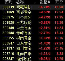 10月11日,贵金属板块逆市走强,截至发稿,晓程科技涨超6%,西部黄金、山金邦际涨超4%,玉龙股份、中金黄金等跟涨。