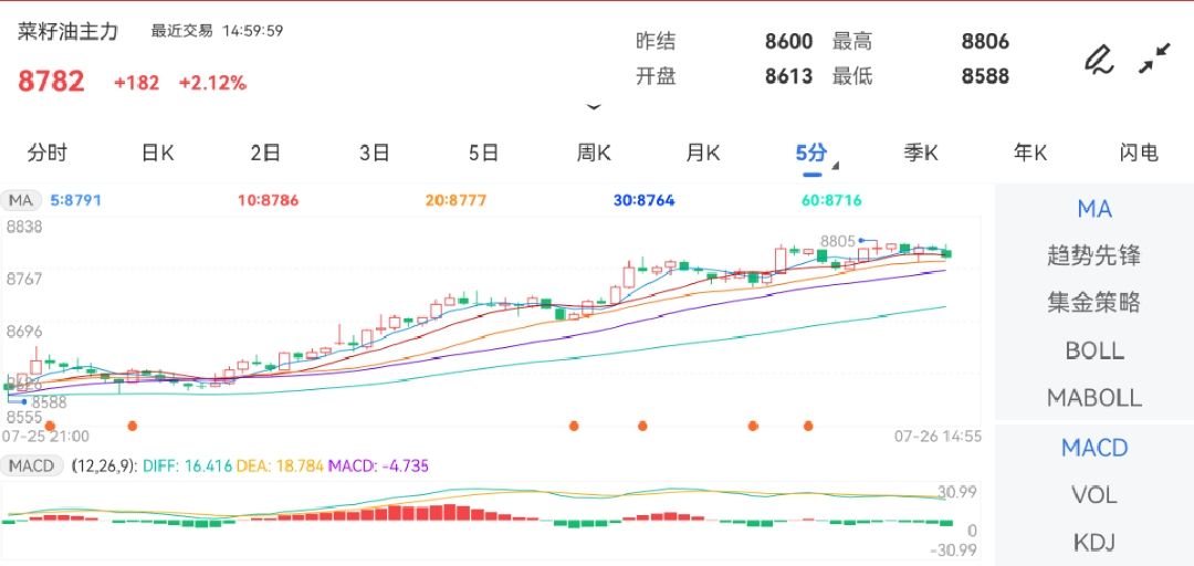 7月26日,邦内期市油脂油料板块。此中,菜籽油期货主力合约开盘报8613.00元/吨,今日盘中高位振撼运转;截至发稿,菜籽油主力最高触及8800.00元,下方探低8588.00元,涨幅达2.17%左近。