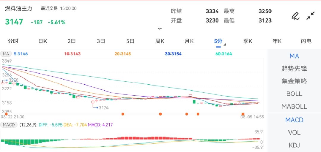 在运输工会解除道路封锁后!原油价格今日行情桶金投网APP行情核心数据显示,截止2024年8月5日下昼15:00收盘,燃料油期货主力合约行情新闻:最新价:3147.00,涨跌:-187.00,涨跌幅:-5.61%,成交量:565495.00,开盘价:3230.00,昨收价:3315.00,最高价:3250.00,最低价:3123.00。