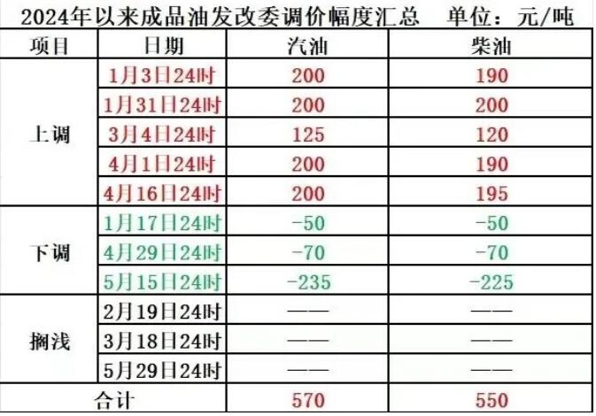 截至目前,本年以后,邦内油价调度共资历了“五涨三跌三停滞”,举座涨众跌少,汽、柴油代价每吨较2023年末区别进步了570元、550元。