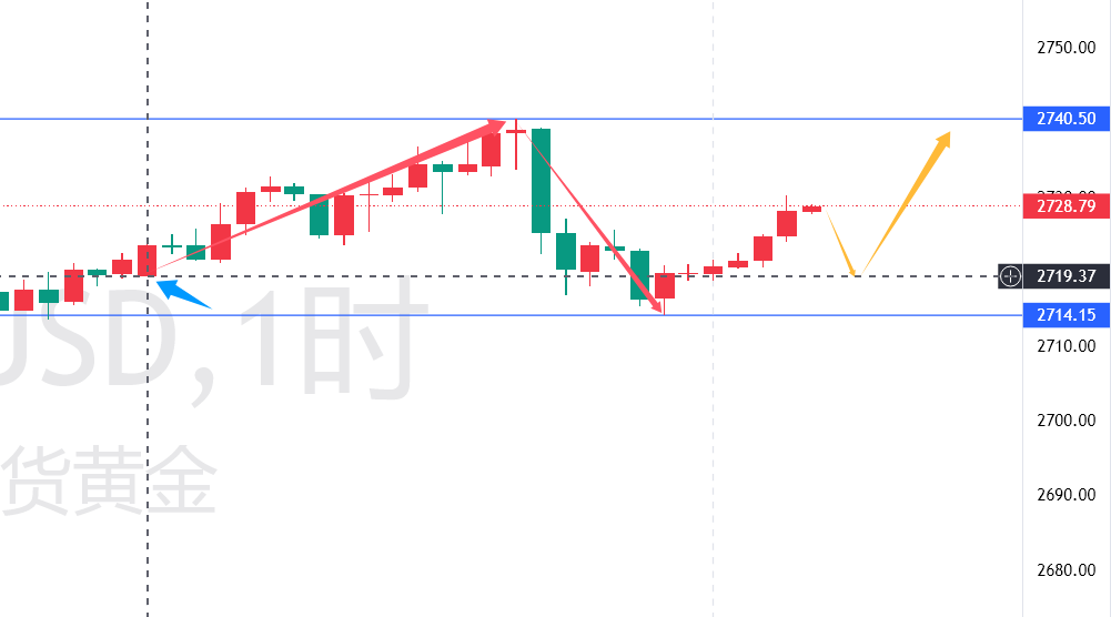 再从小时级盘面来看,金价这回回调还处于2700闭口之上,众头趋向还未粉碎,今日重要闭怀昨天2740的冲破境况。下方闭怀昨日开盘场所2719回调境况,老秦今日的操作思途是恭候金价回调2718左近以2713为珍爱去看涨,即使欧盘没有回调,那么可于2728左近提前上车做众看涨,上方看2740破位去到2748左近。