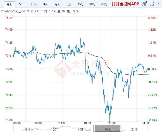 原油市集收盘处境:邦际市集:美东期间,周三(10月9日)收盘,邦际油价整体下跌,此中WTI原油期货收跌0.45%,报73.24美元/桶;布伦特原油期货收跌0.78%,报76.58美元/桶。