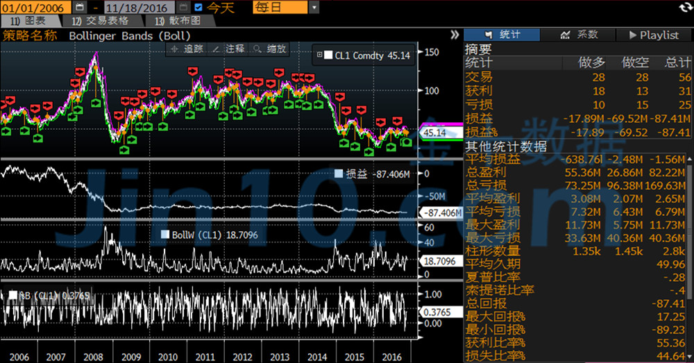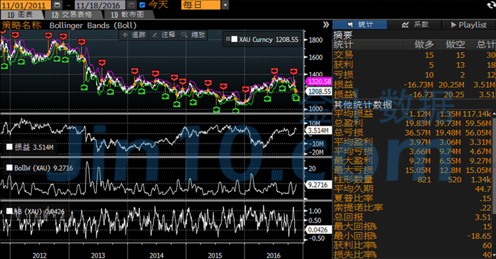 从这个动摇下行的周期能够看出,可推行的生意共有30次,而得益的有18次,告成率已经较高,不过回报率就缩减到可怜的3.51%。此中最大回报率为15%,不过最小回报率则到达-18.65%。然而,若是与原油比拟,无论黄金是处于动摇期,仍旧大行情周期,行使古代的布林带为生意信号仍能获取正向收益。不过,下面咱们将会对“反旧例”的布林带利用举措实行回测,得出的结果将会令投资者大吃一惊。