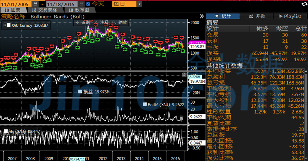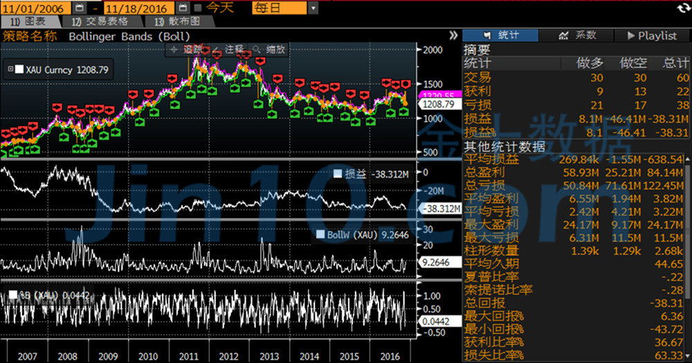 正在这一段10年期牛熊瓜代的周期里,若是用布林带追涨杀跌实行生意,就能够呈现回报率刹那从-87.41%回升到63.01%。总推行生意次数为56次,得益的为25次,耗费为31次。读者应当会呈现,跟使用布林带高扔低吸的告成率完整相反。不过,用这种举措的最大回报率高达173.37%,最小回报率仅为-16.02%。当然,同样的原因,若是把布林带的追涨杀跌生意信号使用到动摇行情,结果一定是耗费的。那使用正在黄金行情上又会若何呢?
