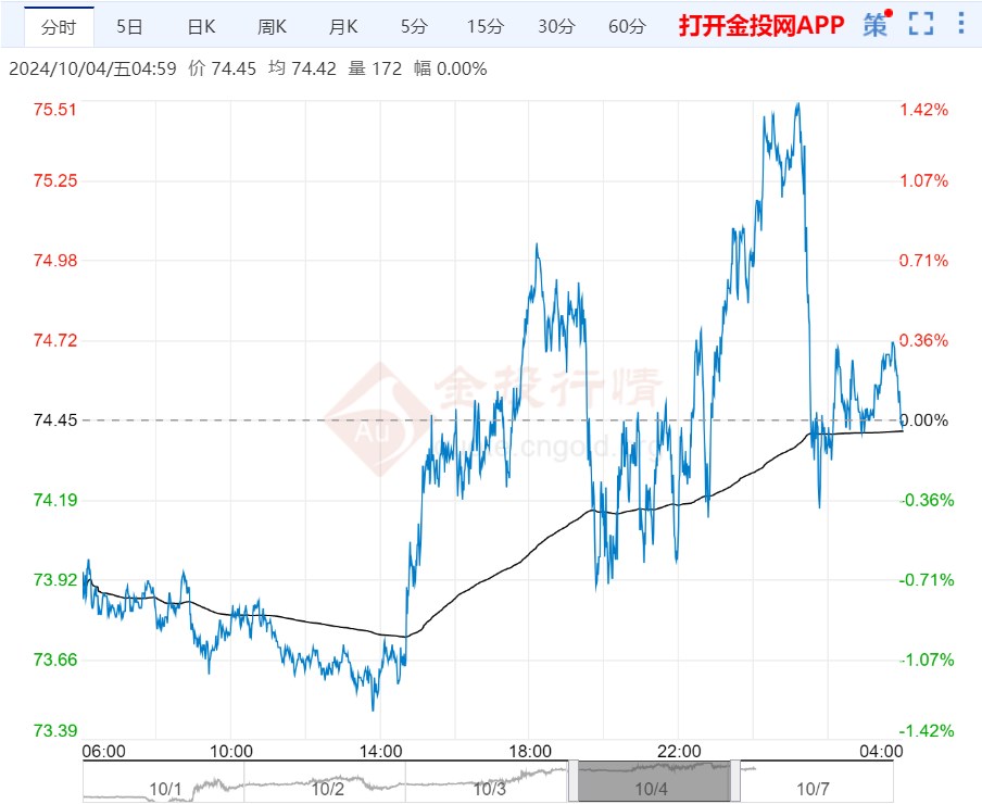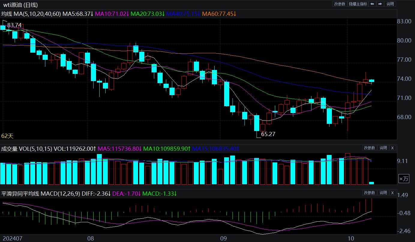 原油走势回忆:礼拜一(10月7日)亚盘时段,美原油价值目前交投于74美元/桶邻近。上周,因顾忌中东冲突也许升级,导致地域供应有断绝危急,众头再现比拟强势,邦际原油价值反弹回升,一连四个生意日收阳,创下一年众来的最大周涨幅。