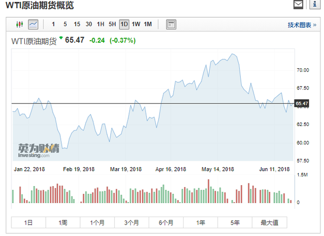 WTI 7月原油期货到期交割日收涨1.15美元,涨幅1.77%,报66.22美元/桶,创6月14日今后收盘新高。WTI 8月原油期货收涨0.81美元,涨幅1.3%,报65.71美元/桶。布伦特8月原油期货收跌0.34美元,跌幅0.45%,报74.74美元/桶。