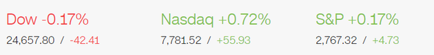 美邦三大股指涨跌纷歧。道指收跌逾40点或0.17%,报24657.80点,连跌七日;纳指收涨0.72%,报7781.52点;标普500指数收涨0.17%,报2767.32点。