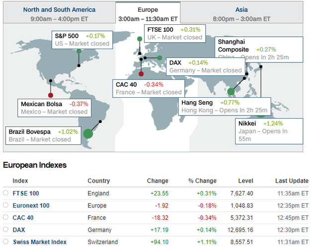 欧洲股市方面,欧洲三大股指大批上涨。英邦富时100指数收涨0.31%,报7627.40点;法邦CAC40指数收跌0.34%,报5372.31点;德邦DAX指数收涨0.14%,报12695.16点。
