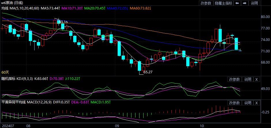 原油市集收盘状况:邦际市集:美东时期,周一(10月14日)收盘,邦际油价整体下跌,个中WTI原油期货收跌2.29%,报73.83美元/桶;布伦特原油期货收跌2.0%,报77.46美元/桶。