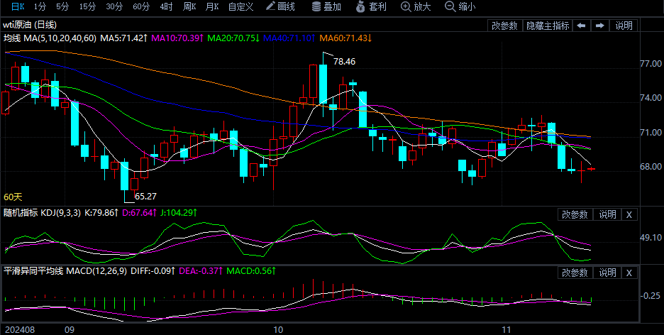 原油走势回忆:木曜日(11月14日)亚盘时段,美原油价钱目前交投于68.3美元/桶邻近。闭键商场连接疲软,需求前景仍旧低迷,EIA方面下调来岁美布两油价钱预期,欧佩克络续下调今明两年的需求预测,商场对潜正在供应过剩顾忌,邦际原油价钱接连外露压制偏空样式。