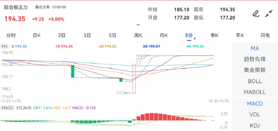 12月25日早盘收盘,邦内商品期货主力合约涨众跌少,化工、玄色金属、有色金属、油脂油料、煤炭、轻化工、谷物板块大批飘红,软商品板块大批飘绿,农副产物板块涨跌各半,原油系、贵金属板块全体上行。此中,胶合板主力封涨停板。