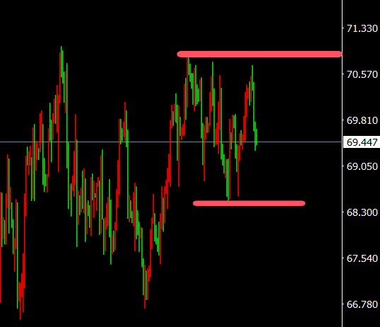 原油周四动摇下行,当天最高70.7,最低69.3,日线,日线看油价仍处于区间运转,四小时线得失,破位进一步下跌,小时线,动摇下行,综述日内操作思绪以动摇为主
