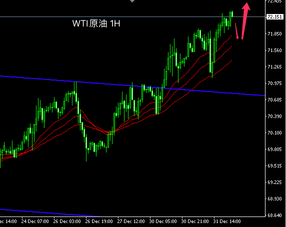 原油短线年第一个贸易日延续上涨节拍油价冲破72价位。均线体系众头布列,短线客观趋向宗旨向上稳固。油价络续改进高,早盘走势处于主趋向向上节拍中。众头动能再现强势,估计日内原油仍将连续上涨改进高。