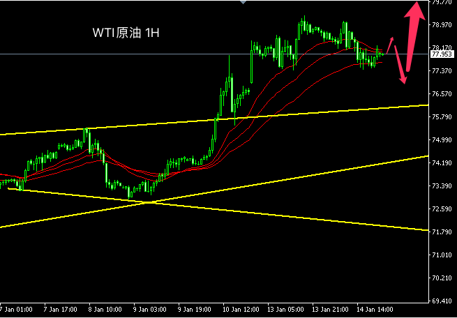 原油短线H)走势高位震动回落,油价着落至前期上涨趋向的道氏点77.40左近,且则取得支柱。短线客观趋向偏向进入盘整。早盘空头动能稍占上风,估计日内原油存正在进一步回落至扩散三角样子上沿寻求支柱,从头转为上行的概率较大。