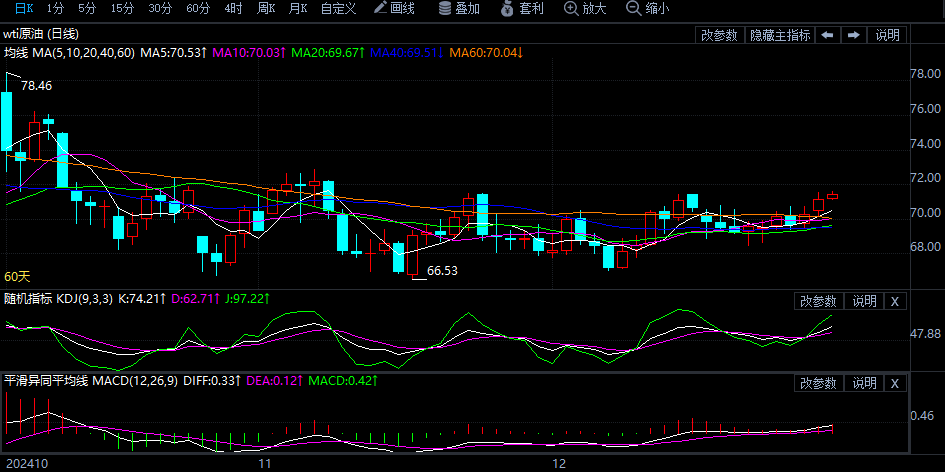 原油走势阐述:本领面上看,昨日邦际油价颠簸交投中迎来探底回升颠簸反弹。亚欧盘时段,原油价钱小幅回落下探,盘中企稳于70.2合口迎来颠簸回升反弹。进入午后欧盘,油价继续拉升冲破并站上71合口延续反弹上涨,最终正在凌晨小幅冲高刺破71.5合口强势收盘,日K线报收颠簸破高中阳。今日油价短线邻近支柱,日内仍旧高空低众轮回参预为主,耐心等候合节点位进场。