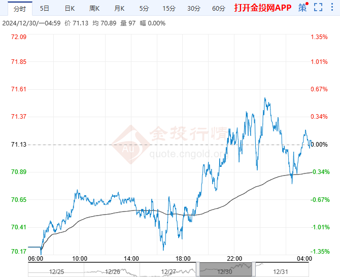 原油走势回忆:礼拜二(12月31日)亚盘时段,美原油价钱目前交投于71.5美元/桶邻近。上周美邦原油库存降幅进步预期,假日时令也提振了燃料需求,昨日邦际原油价钱冲高站上71合口,重回众头强势区域。本日是2024年最终一个来往日,目前根基面并未有转向,收官之际闪现反转的概率不大,接下来络续当心地缘方面的心理变动。