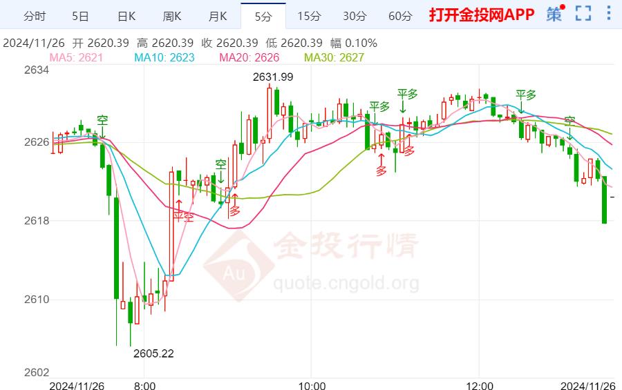 周二(11月26日)本往还日现货黄金日内维护惊动走势,今日开盘报2624.82美元/盎司,最高触及2632.03美元/盎司,最低触及2605.22美元/盎司,截止发稿金价报2615.59美元/盎司,跌幅0.36%。