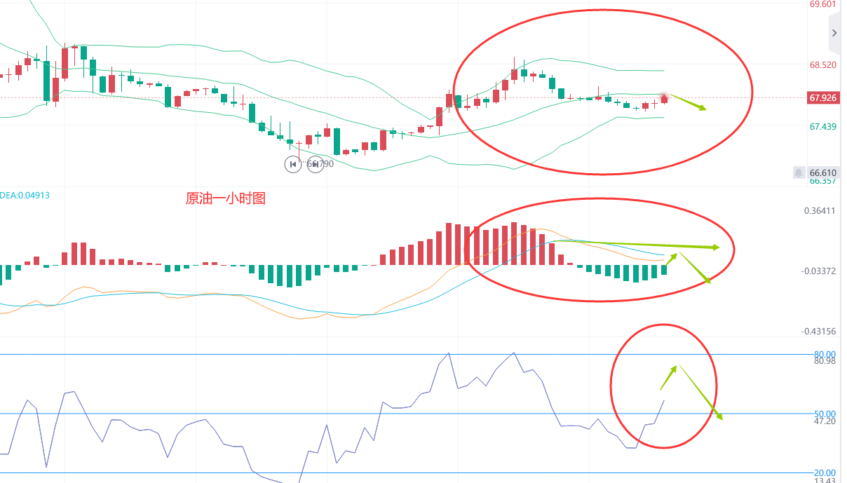 这张原油一小时图能够看出,目前原油代价是位于布林带中轨偏下的职位,目前是没有打破布林带中轨的职位,下方的macd图也能够看出来,目前能量柱再零轴下方,然则动能陆续放缓,均线位于零轴之上即将映现金叉,然则这波反弹臆想难以打破前线的高点,下方的rsi图能够看出来目前再50线之上,上方有上涨空间,正在布林带中轨被打破之前都不创议过分于乐观的去看原油这波反弹,告捷踩稳布林带中轨之后能力看新高点。
