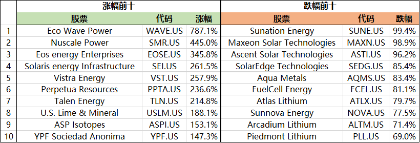 但是,正在个股方面,以能源股为主的SPDR能源指数正在2024年结尾时上涨2.1%。从涨跌幅来看,2024年能源和自然资源类股涨跌幅前十的股票如下: