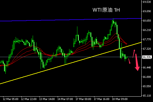 原油短线左近后,受强阻力下跌。其下行力度发扬更为强劲,且收复前三个往还日的涨幅。从主次节律看,目下首要趋向对象为向下,空头动能占上风,估计日内原油走势延续下跌节律,看66.30维持。