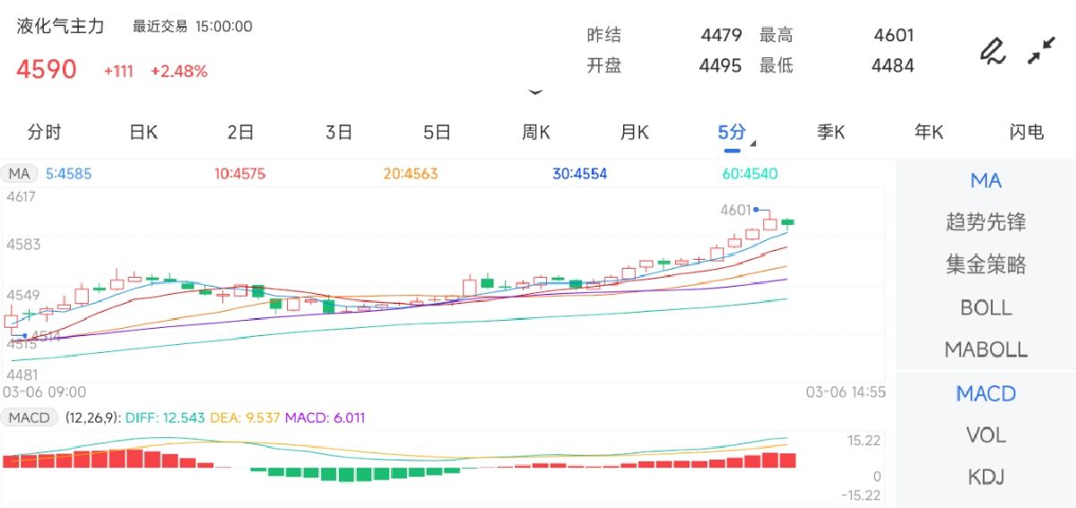 3月6日,邦内期市能化板块众半飘绿。此中,液化石油气期货主力合约开盘报4495.00元/吨,今日盘中高位颠簸运转;截至发稿,液化石油气主力最高触及4561.00元,下方探低4484.00元,涨幅达1.59%邻近。
