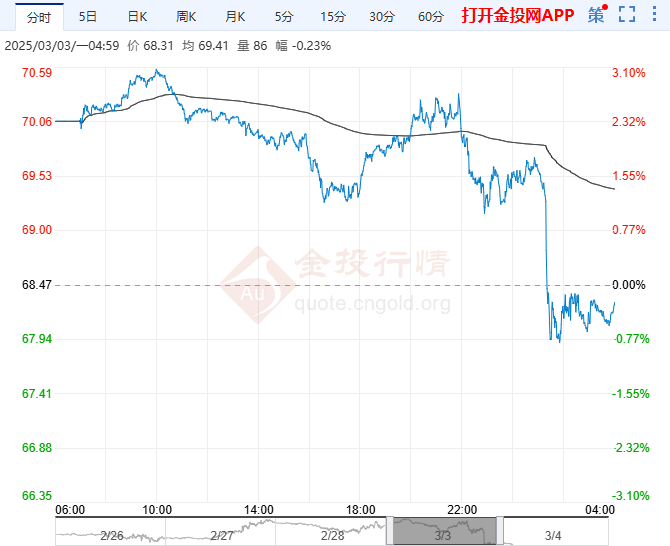 星期一(3月3日)亚盘时段2025/4/27现货原油价格走势图礼拜二(3月4日)亚盘时段,美原油价值目前交投于68美元/桶邻近。据称OPEC+将按布置正在4月增众石油产量,以及美邦总统特朗普展现对墨西哥和加拿大商品征收25%的闭税将于3月4日生效,投资者操心可以会损害环球经济拉长和石油需求,邦际油价承压回落,短期或保持震撼偏弱运转。