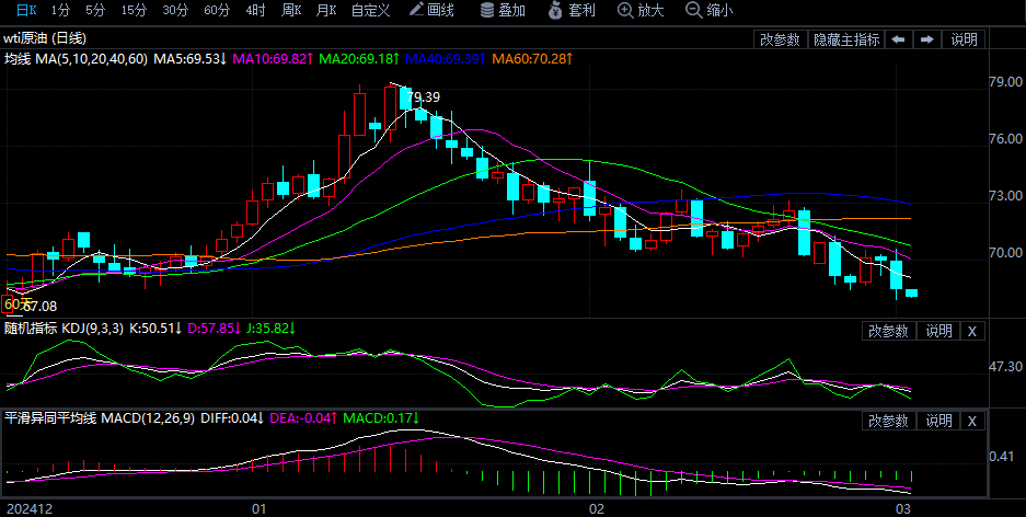 礼拜三(2月26日)亚盘时段,美原油价值目前交投于69.2美元/桶邻近。美邦生意闭税威逼仍令人操心,环球经济前景疲软组成压力,加剧了墟市对能源需求放缓的操心,以及少少产油邦展现石油产量希望增众,邦际原油价值大幅回落,盘中失守前期低点70整数闭口,创下两个月低点。