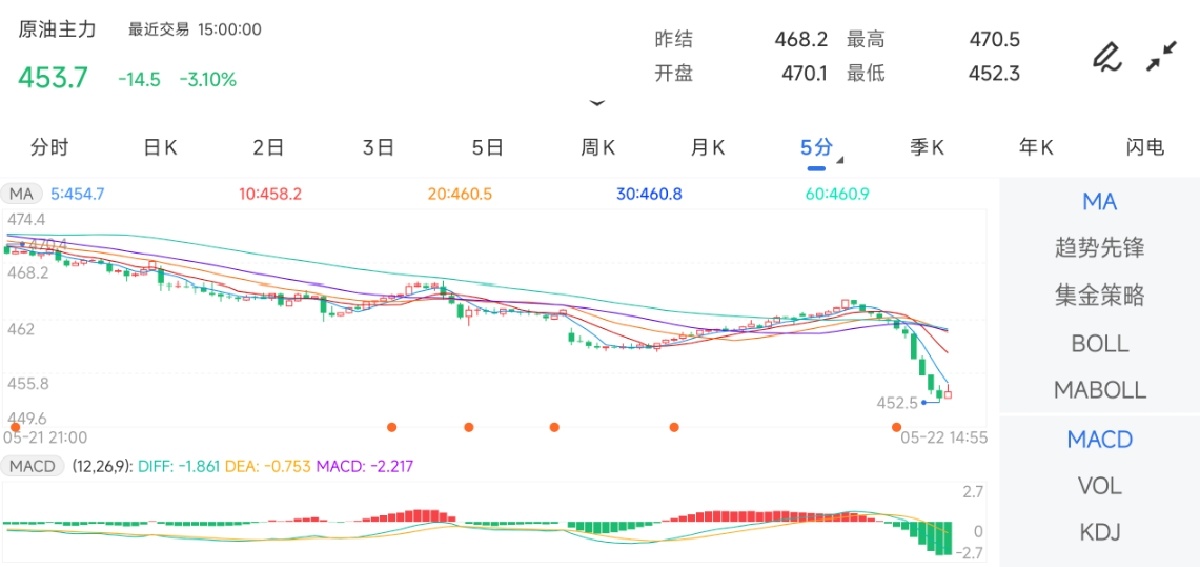 5月22日,邦内期市主力合约涨跌互现。此中,原油期货主力合约开盘报470.1元/桶,今日盘中低位惊动运转;截至收盘,原油主力最高触及470.5元,下方探低452.3元,跌幅达3.10%。