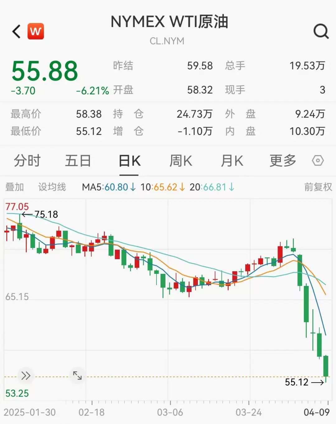 截至记者发稿,布伦特原油报59.09美元/桶,为2021年2月今后初度跌破60美元/桶,日内跌超5%,4月今后,7个贸易日累计跌幅已抢先20%;WTI原油日内跌超6%。