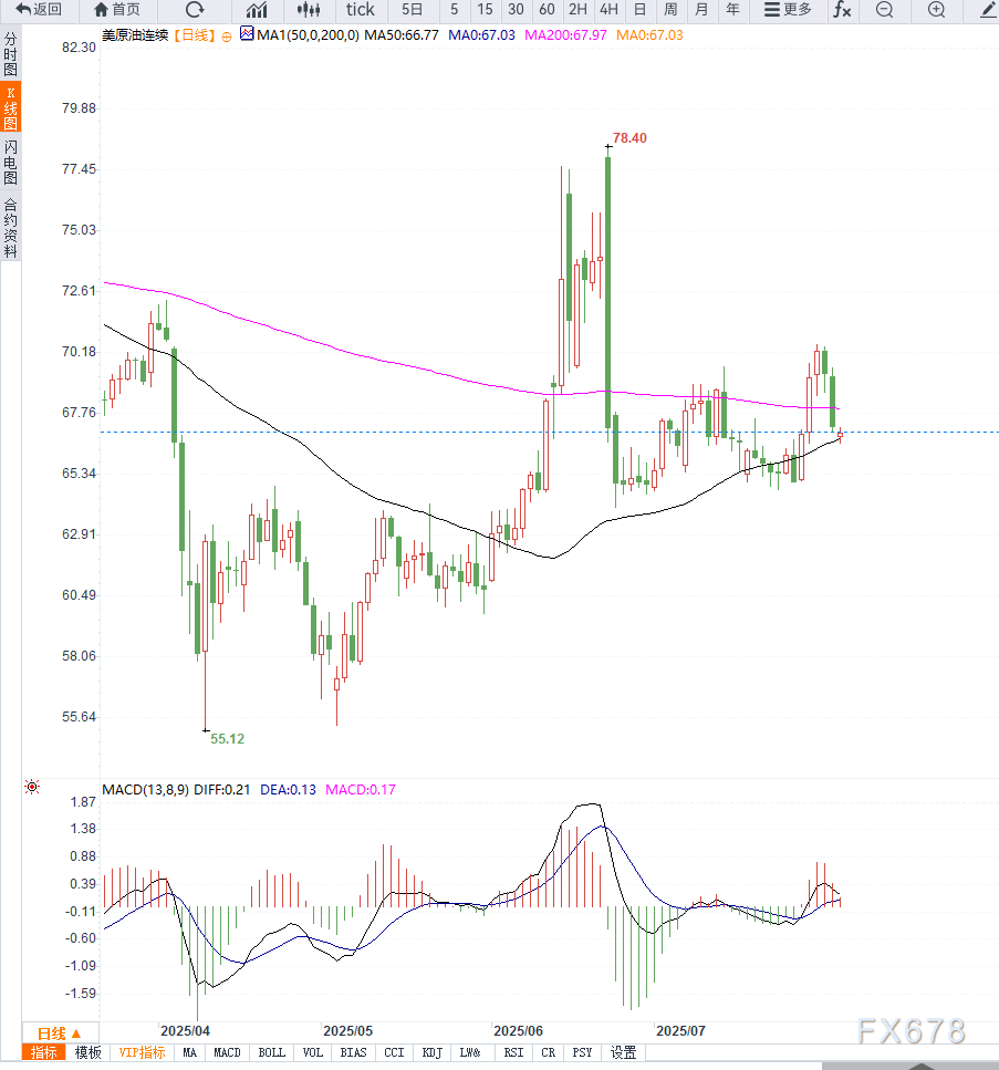 从身手面来看,美原油(WTI)日线图显示价钱跌破枢纽支柱位70美元,延续短期下行通道。目前K线继续两日收阴,MACD速慢线呈死叉发散,显示空头力气主导市集;
