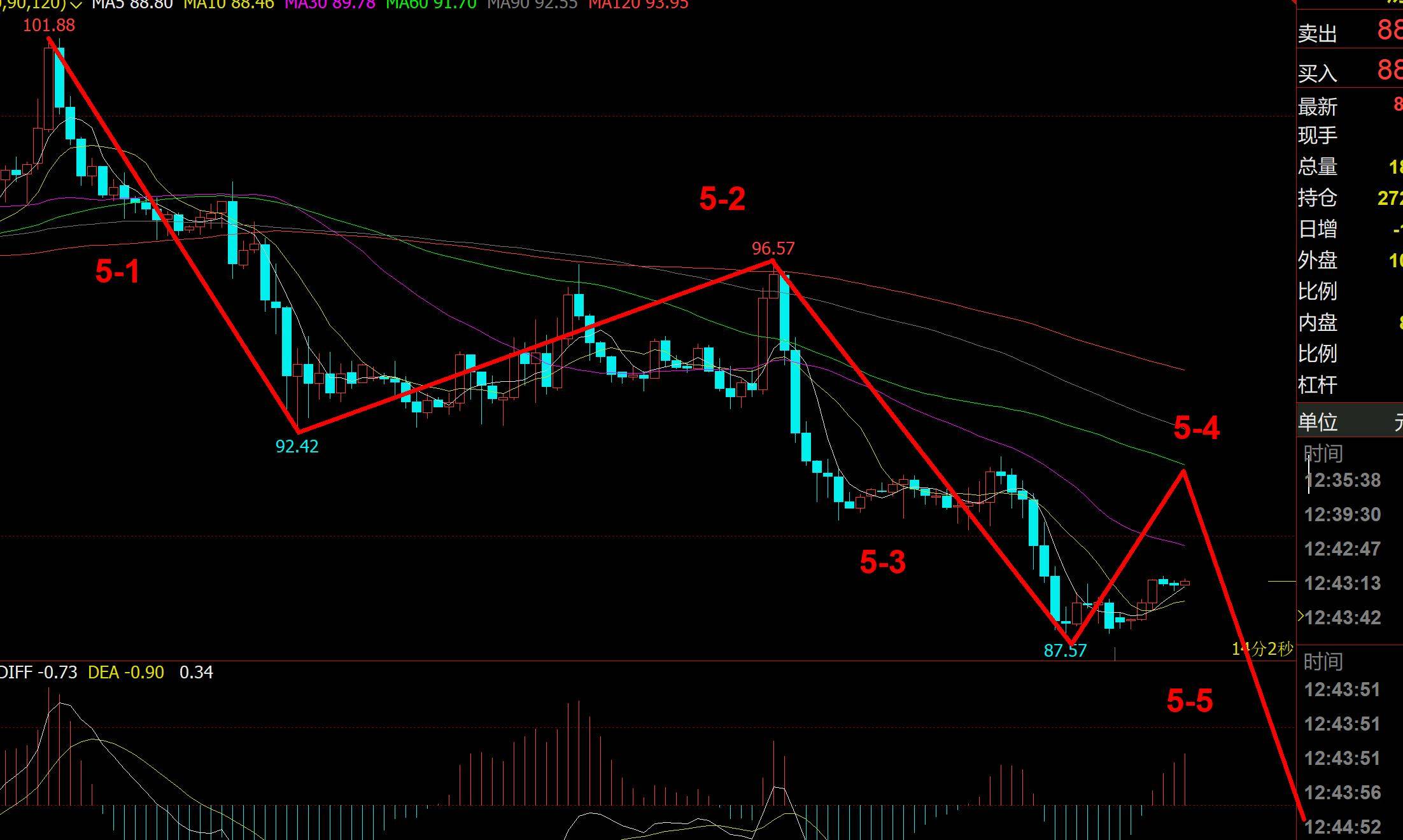 持续昨日的线小时级别上昨日的下跌是5浪下跌的初步,5浪的开始是101.88美元,到目前的低点87.57美元,跌幅为14.31美元,1浪的下跌幅度为18.42美元,那么5浪的下跌空间起码又有6-7美元足下;也即是正在81-80美元这个区间,也即是切合了老李正在周一和昨日著作的剖析预判,咱们再去细化5浪下跌进程的子浪,假设行情从101.88摔倒92.42美元的5-1浪的线浪,涨幅为4.15美元,行情从96.57美元到87.57美元即是5-3浪下跌,跌幅为9美元,这个5-3浪是个萎缩的主跌浪,可是也极有恐怕目前的低点87.57美元不是5-3浪的止境,咱们先把87.57美元看作是5-3浪的止境,那么遵循2浪的幅度算计4浪的止境大抵正在91.72美元左近,遵循目前5-3浪的幅度小于5-1浪,那么咱们就把5-4浪的止境消重正在90.10-89.80这个区间之内,遵循5-1浪的幅度算计5-5浪的止境大抵就正在80.55美元左近,如此的算计子浪止境和主跌5浪止境基础相似,因此今日的操作环绕5-4浪的止境做空为主;如下图;