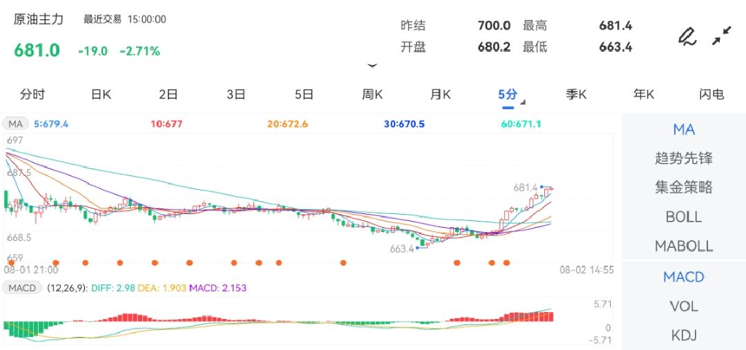 8月2日期货软件走势图综述:原油期货主力跌271%金投网APP行情中央数据显示,截止2022年8月2日下昼15:00收盘,原油期货主力合约行情音讯:最新价:681.0,涨跌:-19.0,涨跌幅:-2.71%,成交量:238704手,开盘价:680.2,昨收价:692.1,最高价:681.4,最低价:663.4。