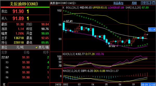 4小时上,上周五原油承压中轨下行,晚间一度下跌触及下轨后回升,但仍运转于均线下方,而今布林带处于启齿期,MA均线三线向下,KDJ随机目标三线向上,MACD目标赤色动能柱着手呈现,疾慢线金叉向上,归纳来看,原油今日短线操作思绪上提议以回调低众为主,反弹高空为辅,上方短期重心体贴93.1-94.5一线阻力,下方短期重心体贴90.0-89.2一线支持。