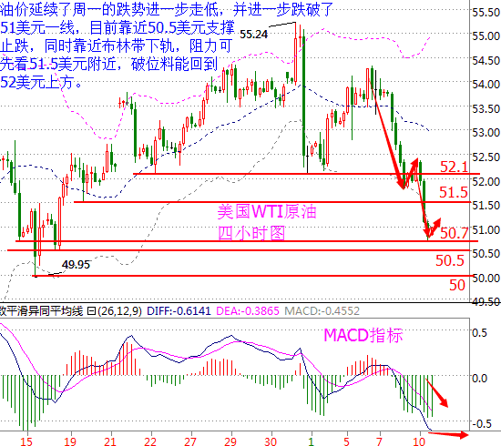 美邦WTI原油从四小时走势图来看,油价延续了周一跌势进一步走低,并进一步跌破了51美元一线美元维持姑且止跌,同时该点位于下轨左近,阻力能够先看51.5美元左近,破位料能回到52美元上方。