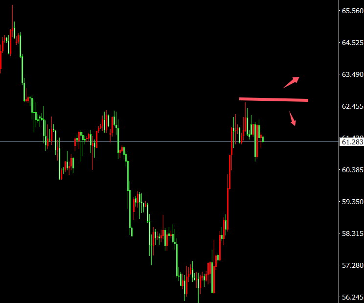 原油周一区间颤动,当天最高62.1,最低60.6,日线,日线看油价还将不断颤动,上方闭怀63的打破情状,四小时线,布林轨收口,油价处于中轨,尚有下跌的空间,下方闭怀60一线,小时线,呈区间颤动,综述日内先看60-63区间,打破再看顺延