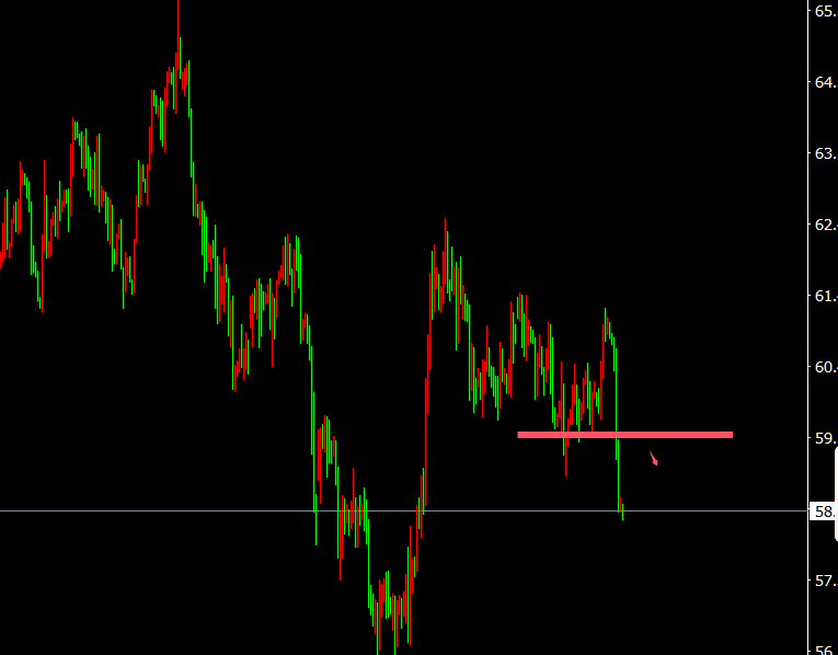 原油周三大跌,当天最高61.0,最低58.1,日线,日线看油价大跌收大阴线虽尚有下跌的势头,但日线样子仍处于区间呈大区间颠簸,今下方眷注57一线,四小时线,颠簸下行,小时线,低位颠簸,有反弹的势头,上方眷注59.5和60,日内操作思绪反弹空为主,早间API数据利众,眷注晚间EIA数据出现