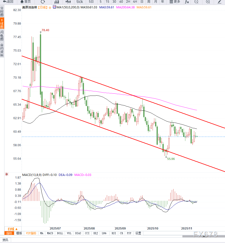 身手目标方面,RSI处于中性偏弱区域,未睹彰着反弹信号;MACD坚持低位粘合,显示动能亏空。要害支持位仍正在58.30美元左近,该区域若被有用跌破,将翻开进一步下探空间;