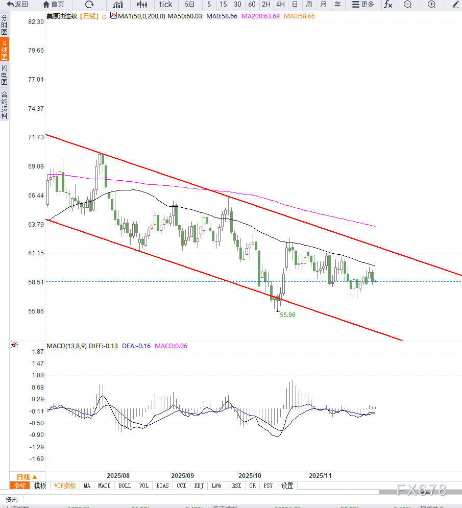从WTI日线图走势来看,油价正在跌破60美元闭口后已彰彰跌穿短期均线维持区,并触及近一个月震撼平台的下缘位子。近期衔接阴线显示空头气力主导行情,MACD动能柱连续夸大正在零轴下方,响应趋向延续弱势。