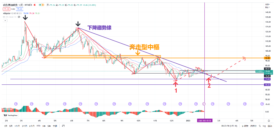 WTI原油目前保卫于80合口下方整固,前期一系列更高的高点与更高的低点预示油价底部或已产生,