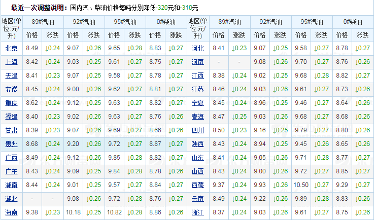 四大直辖市中上海油价较低,92号汽油每升为9.03元、95号汽油为9.61元、0号汽油为8.75元;重庆油价较高,92号汽油为9.12元、95号汽油为9.63元、0号汽油为8.82元。