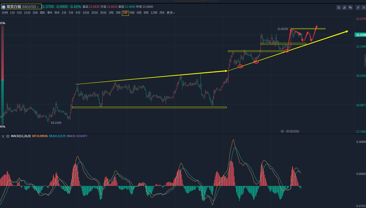 从图中白银1小时周期图看,白银底部做了箱体底部样子后造成了众头趋向,目前行情延续众头趋向稳定。昨日代价正在21.10相近得回撑持造成小双底样子,标k强势冲破连接更始高拉升,节拍上看白银走冲破箱体后回踩箱体顶边撑持节拍,重心一向上移。从k线力度看,众头动能相对强势,众头连接延续上涨趋向稳定。团结目标MACD看,疾慢线轴上方运转,透露众头主导行情走势,行情每次回调0轴相近或者撑持后再次浮现金叉信号,众头开启新的一轮上涨行情。政策上投资者逢低做众思绪为主。