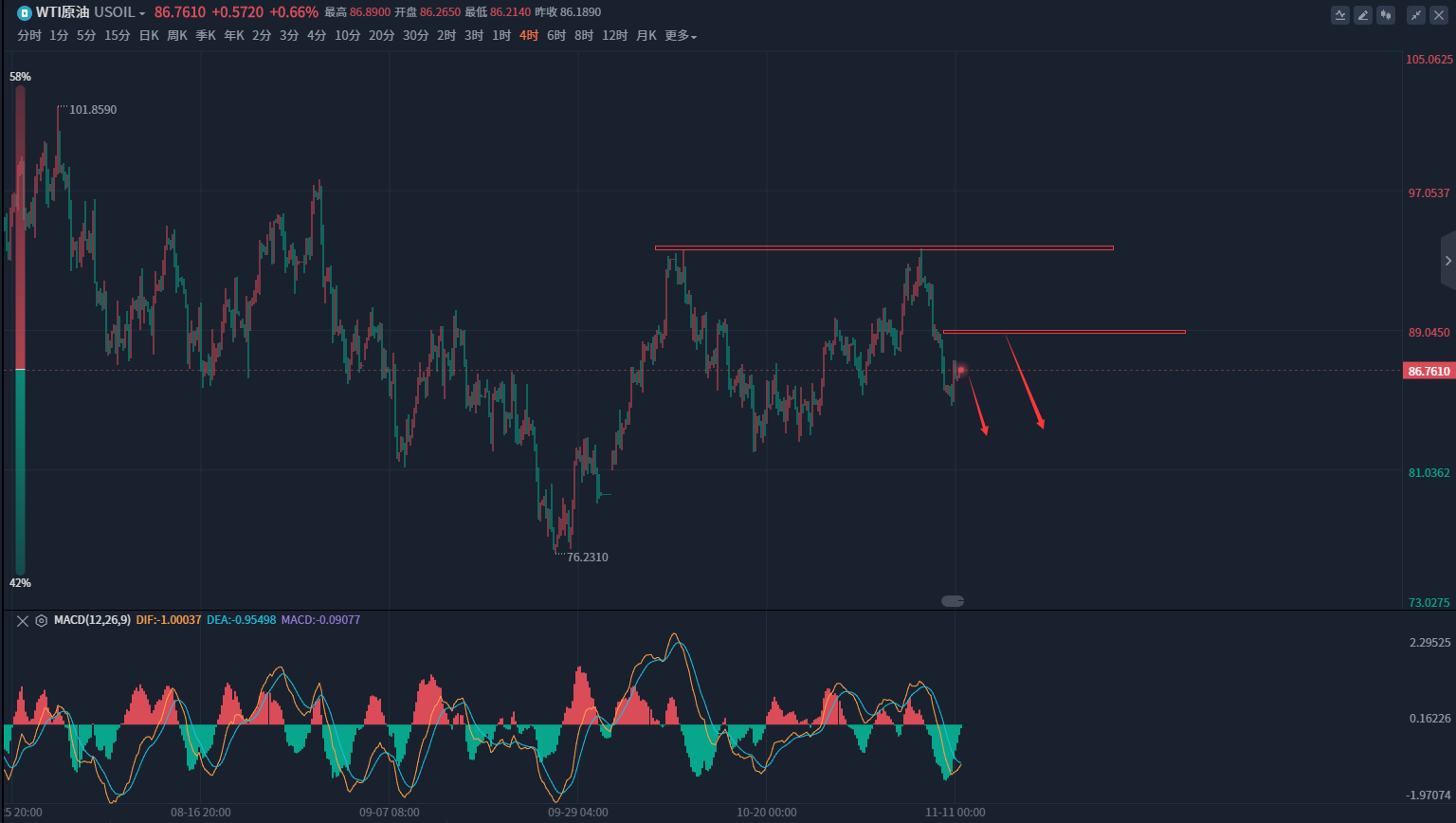 激进者参考86.8-87.1区间进场空单,止损0.6美金,止盈看84下方。