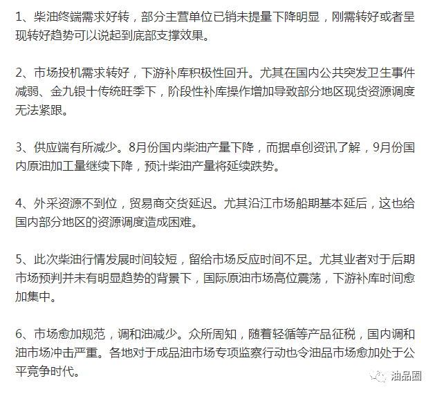 看待近期邦内制品油墟市柴油价钱的上涨,墟市需理性对待。以主营单元为例,今朝柴油价钱水准较6、7月份仍有150-200元/吨的价差。此番推涨仅仅是对的8月份墟市继续平淡后的集结短暂开释。其次,柴油价钱的上涨时光点适值浮现正在9月份(古板金九银十),导致墟市闭怀度极高。