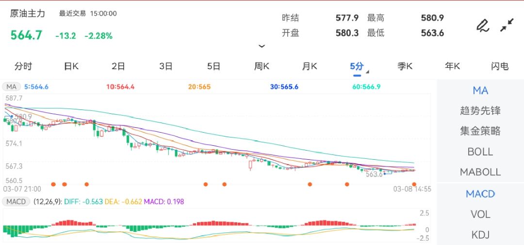 3月7日,邦内期市原油系板块涨幅居前。个中,原油期货主力合约开盘报568.4元/吨,今日盘中高位振撼运转;截至收盘,原油主力最高触及589.7元,下方探低568.0元,涨幅达3.08%。