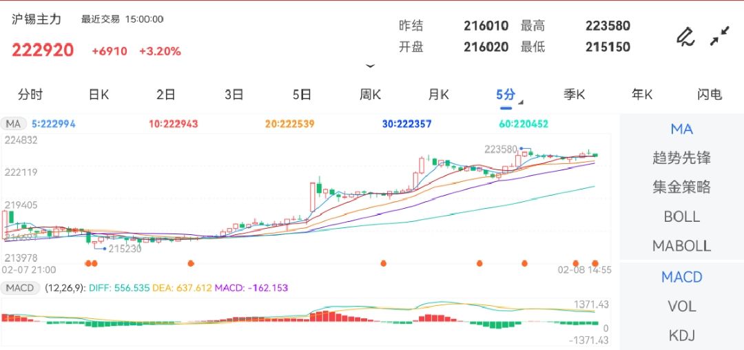 成交量:155699手投资现货黄金和黄金金投网APP行情中央数据显示,截止2023年2月8日下昼15:00收盘,沪锡期货主力合约行情音信:最新价:222920,涨跌:6910,涨跌幅:3.20%,成交量:155699手,开盘价:216020,昨收价:216900,最高价:223580,最低价:215150。