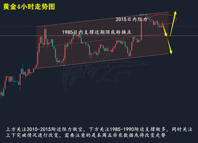 黄金手艺面来领悟,日线上,周四黄金较前一个业务日探高回落小幅收阳后睁开下跌,盘中录得小阴,日线上,目前黄金并未粉碎上行通道直线上行,短期或有下跌趋向;4小时上,周四黄金舒缓下行,盘中延续受阻MA10日均线走跌,眼前布林带处于启齿期,MA均线走出双死叉,KDJ随机目标三线向前,MACD目标绿色动能柱放量,疾慢线死叉向下,归纳来看,目前黄金短期仍有下行,下周一操作提倡反弹2010-2015邻近阻力做空,同时下方体贴1985-1990邻近支持,日内体贴上下打破状况举行改造即可,需求留神的是本周五非农数据影响,若数据利众也许赓续走高,若数据利空则放大跌幅。