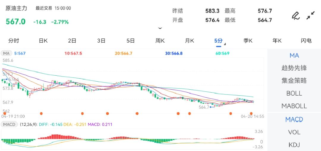 截止2023年4月20日下午15:00收盘—成品油包括哪些油金投网APP行情核心数据显示,截止2023年4月20日下昼15:00收盘,原油期货主力合约行情消息:最新价:567.0,涨跌:-16.3,涨跌幅:-2.79%,成交量:155160手,开盘价:576.4,昨收价:580.8,最高价:576.7,最低价:564.7。