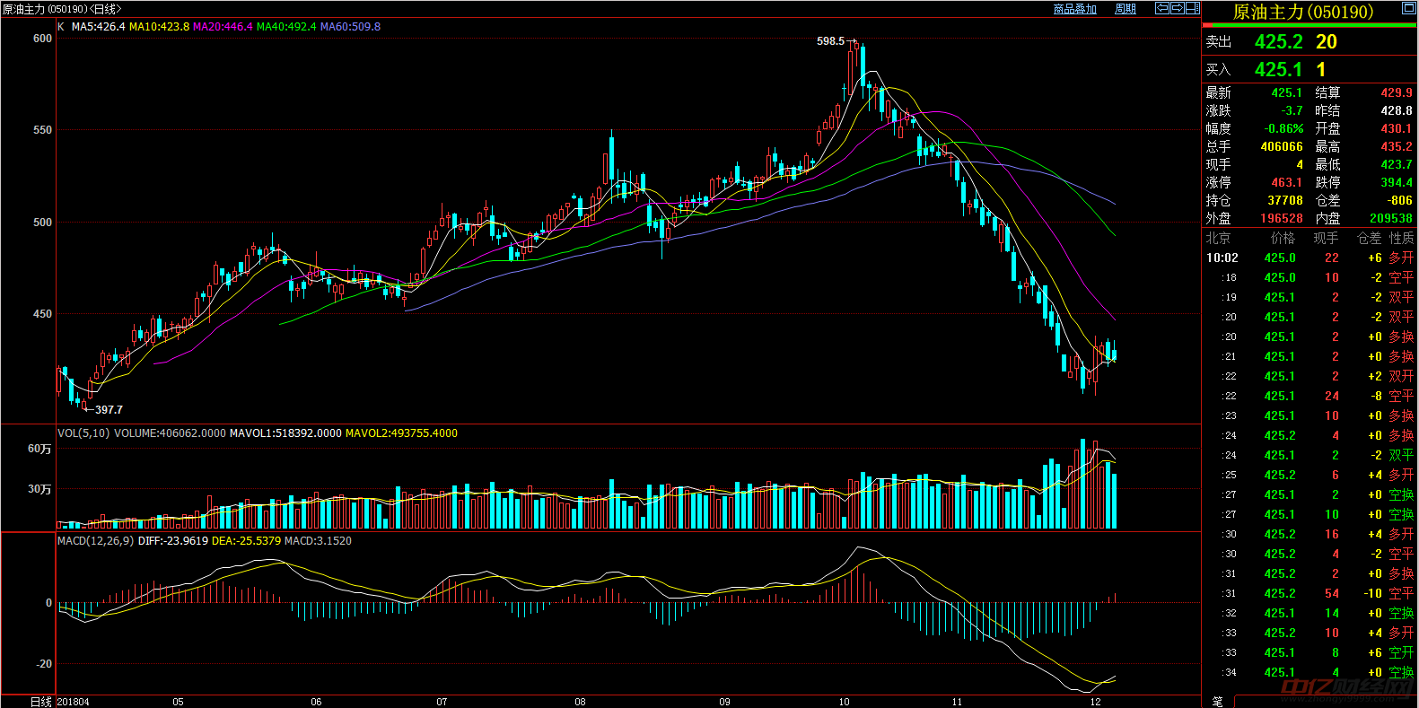 INE原油主力日线.上海原油期货:日线合约价值颠簸下行收阴线上方,K线状态来看,盘面下方仍有较强撑持,技能回调幅度有限,反弹行情或并未完结;均线延续空头摆列状态,短期墟市展现买入信号,盘面上方仍有较大的下行压力;成交量上看,上个贸易日墟市成交小幅放量,投资者卖盘贸易为主;DIFF、DEA两线轴下方金叉向上运转,红柱接连扩张;归纳来看,短期盘面众气氛力博弈,原油1901合约价值颠簸料理运转的概率较大。